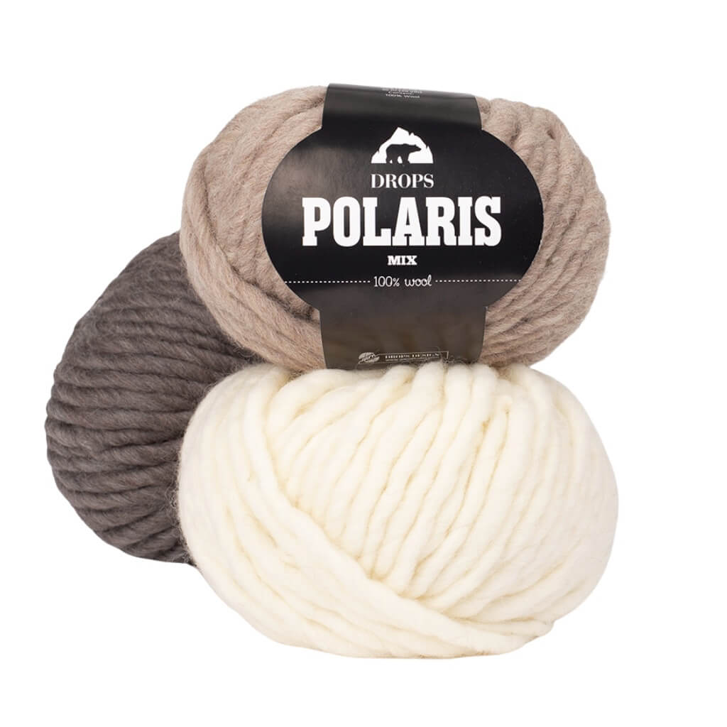 Polaris besteht übrigens aus der gleichen Wolle wie Drops Snow und hat die gleiche Maschenprobe wie doppelt verstricktes Drops Snow.