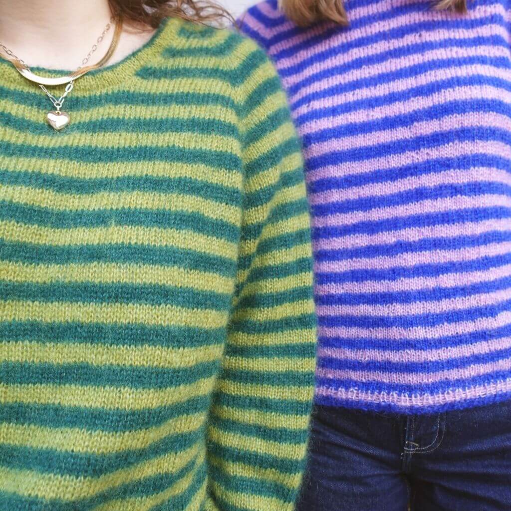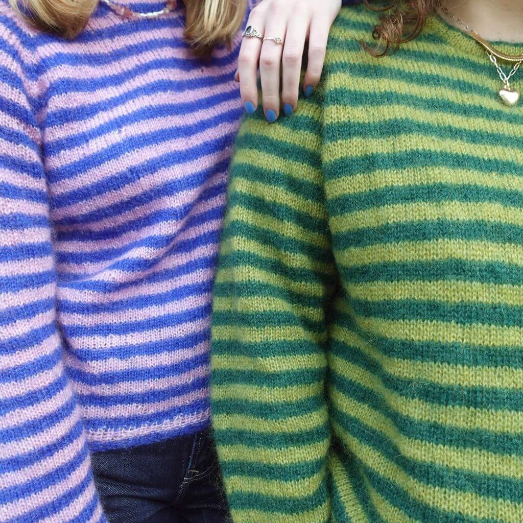 Die Mollie Blouse ist eine Strickanleitung für eine gestreifte Bluse aus zwei Farben eines Mohair-Garns. Das Streifenmuster wechselt alle paar Reihen und verleiht der Bluse eine moderne Note. Die Bluse wird von oben nach unten gestrickt und bietet einen lockeren, luftigen Schnitt. Mit ihrem Raglanschnitt und den transparenten Mohair-Eigenschaften ist sie ein vielseitiges Layering-Piece für jede Garderobe.
