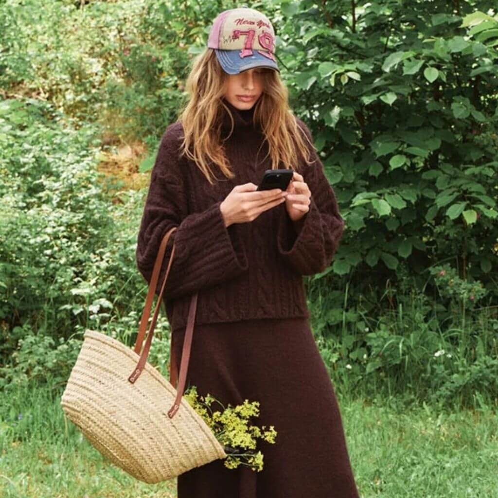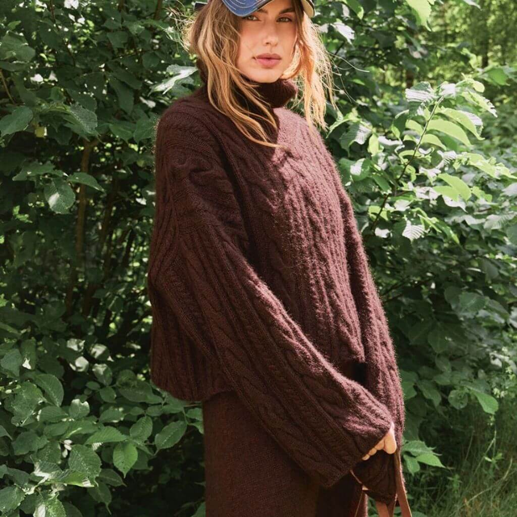 - Farben: Nr. 4381 Dark fudge Sunday und Nr. 4381 Dark fudge Tynn Silk Mohair (einfarbige Version); Nr. 2573 Monk's robe mit Nr. 7772 Rainforest Sunday und Nr. 2573 Monk's robe mit Nr. 7772 Rainforest Tynn Silk Mohair