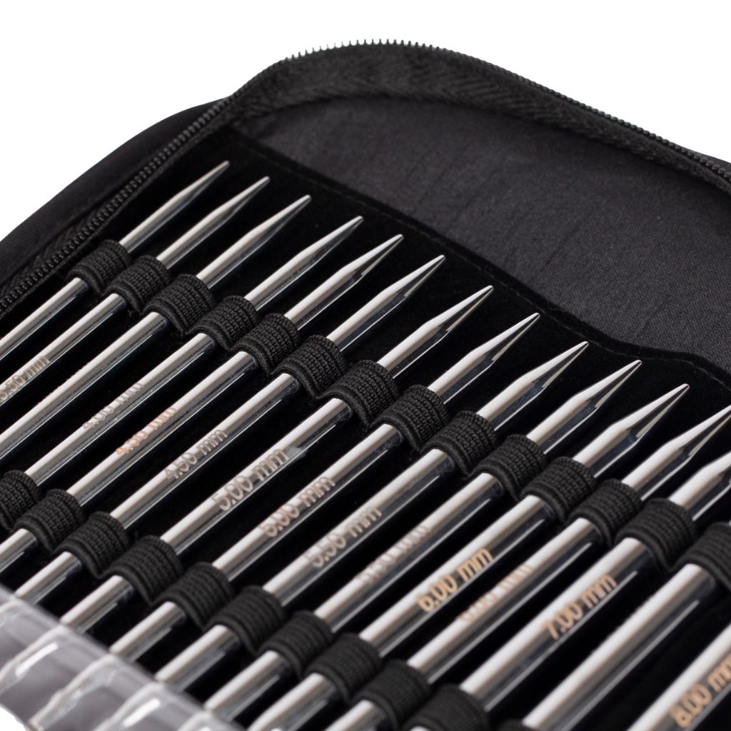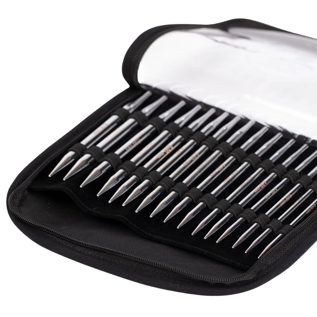 Das Set wird in einem transparenten Nadeltäschchen mit Reißverschluss geliefert und umfasst je 8 Paar Nadelspitzen aus vernickeltem Metall. Dazu erhältst du natürlich das passende Zubehör, wie Seile und Seilschlüssel.
