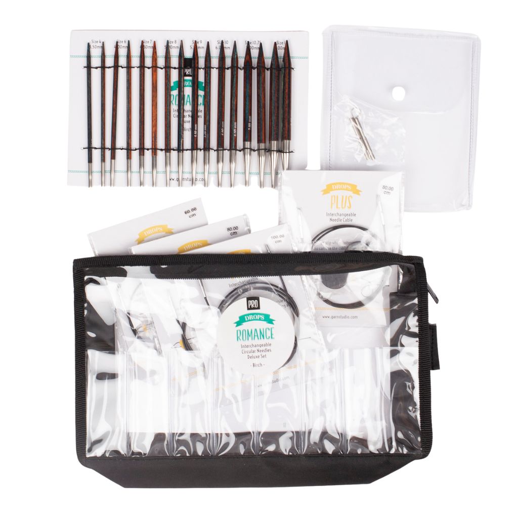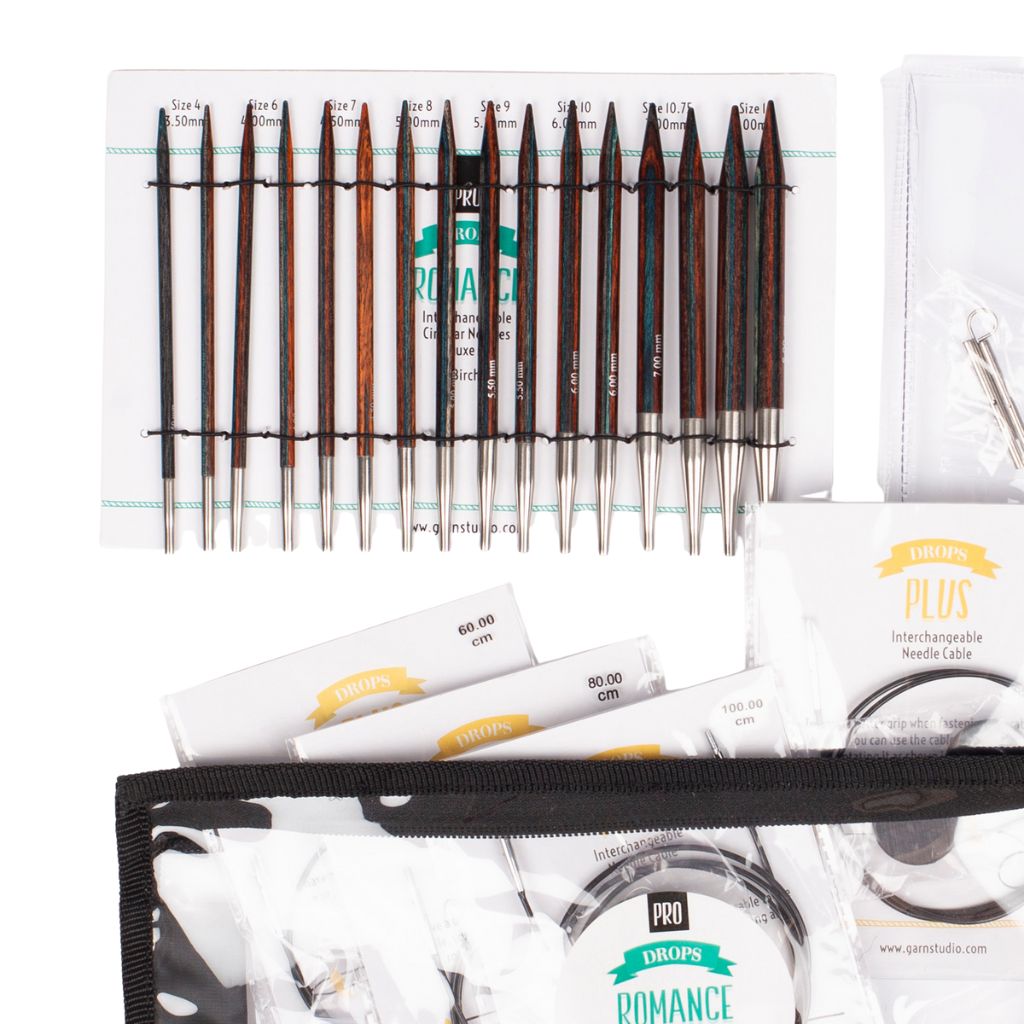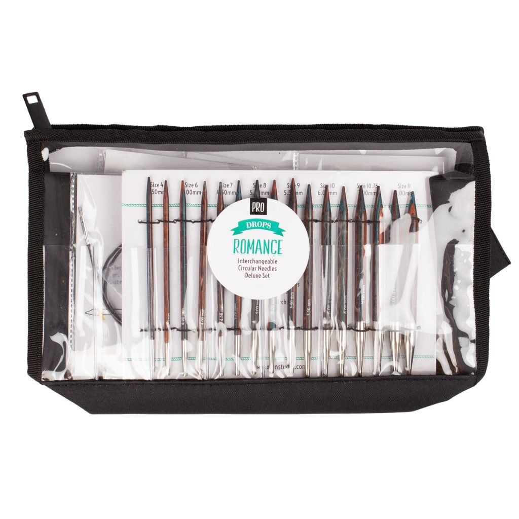 Das Pro Romance Deluxe Set von Drops bietet dir ein vielseitiges System mit austauschbaren Rundstricknadeln. Dieses Set ist sofort einsatzbereit und kommt in einer praktischen Reißverschlusstasche mit durchsichtigem Fenster.