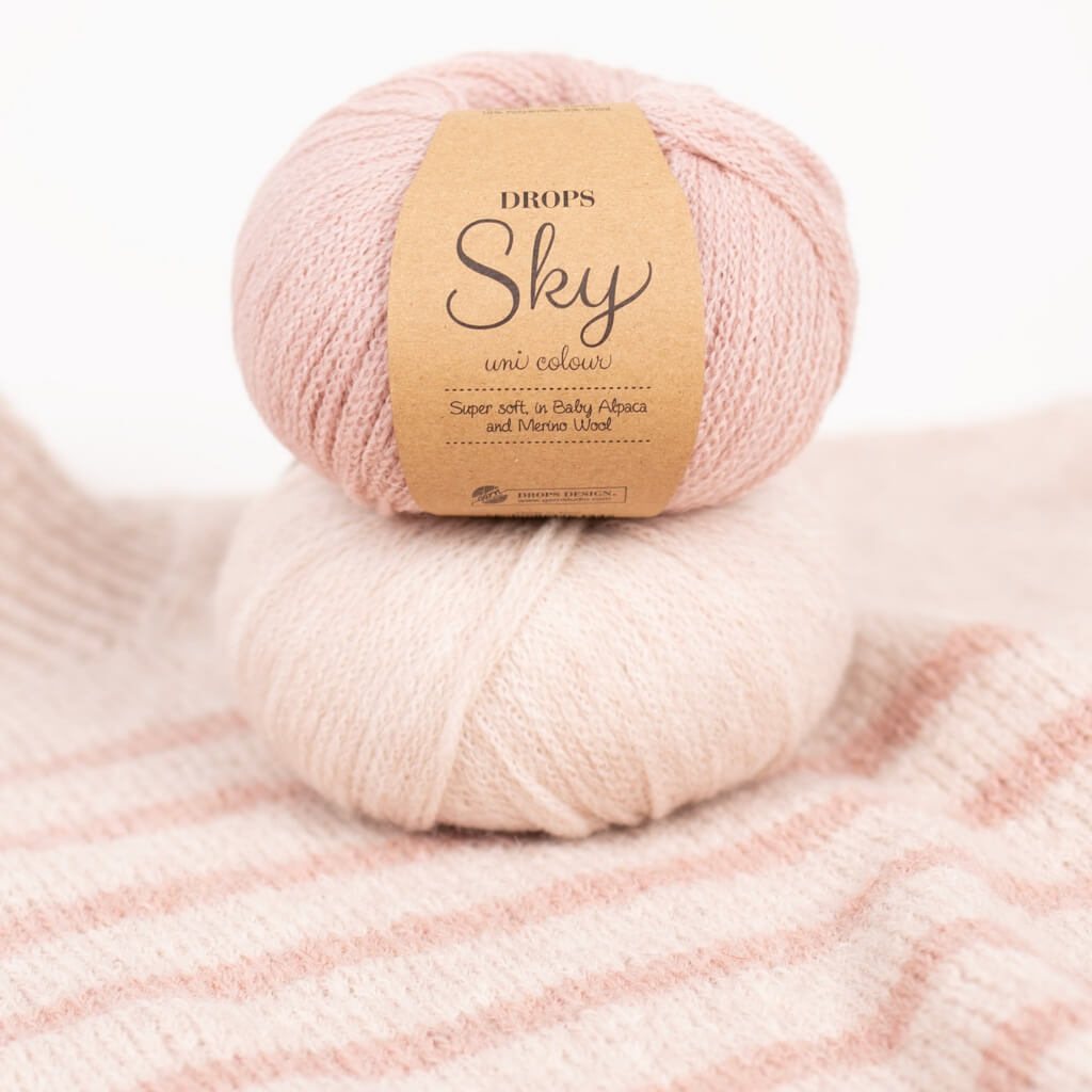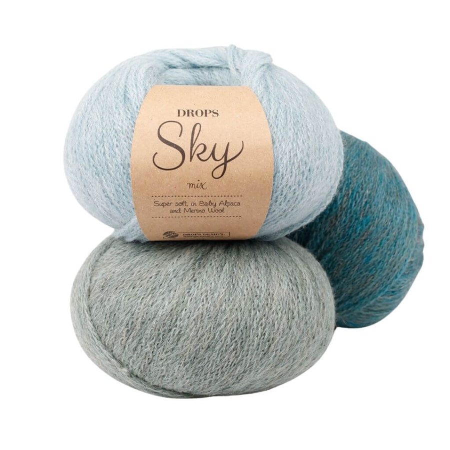 Drops Sky kombiniert Babyalpaka, Merinowolle und Polyamid zu einem weichen und leichten Garn. Die röhrenähnliche Struktur macht es atmungsaktiv und haltbar, während es sich gleichzeitig sich luxuriös anfühlt.