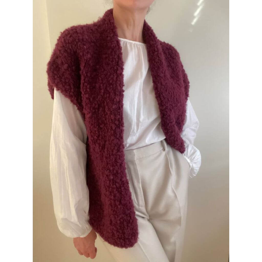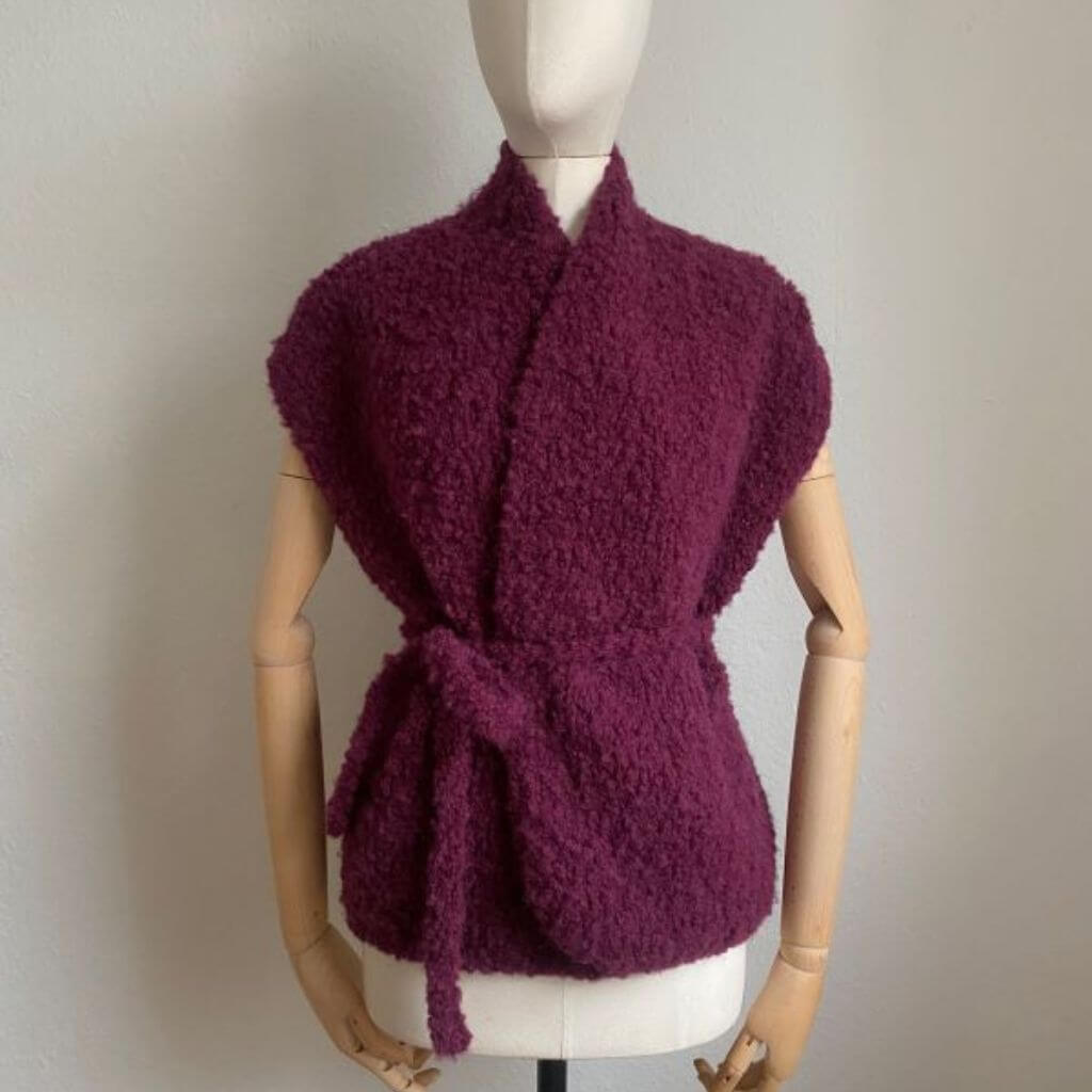 Mit der FLUFFY MARTA Vest Strickanleitung kreierst du eine Strickweste mit Stehkragen und V-Ausschnitt. Die Vorderteile überlappen dezent und lassen sich mit einem Gürtel schließen. Der taillierte Schnitt betont deine Figur, während die Schultern locker und überschnitten gearbeitet sind.