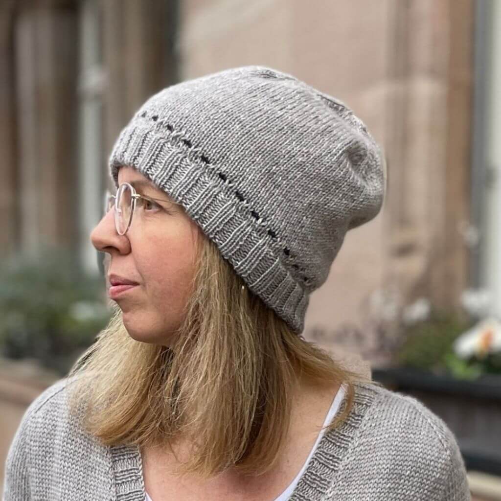 Die Grea Mütze von Strickauszeit Designs ist eine Strickanleitung für eine klassische Beanie mit Rippenbündchen. Die Mütze wird von unten nach oben in Runden gestrickt und bietet dir ein interessantes Hebemaschenmuster-Detail über dem Bündchen.