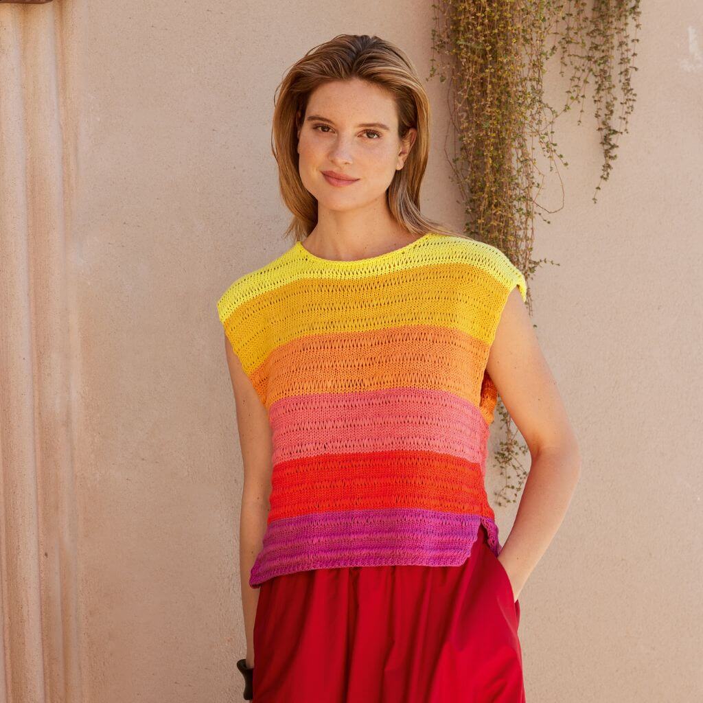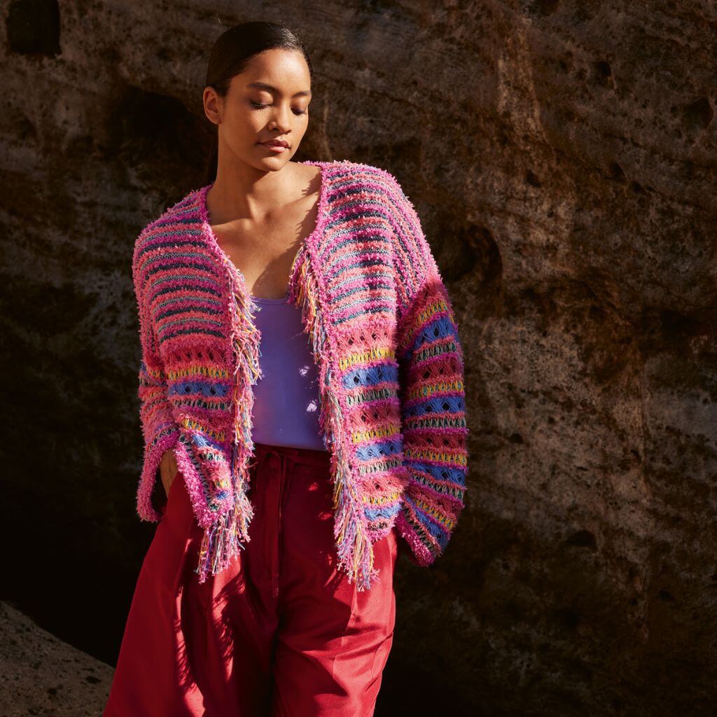 Das Magazin stellt dir neun neue Sommergarne vor, darunter Frizzante, Filo Paillettes, Ella, Tessera und Corallo. Die Designs kombinieren verschiedene Techniken wie Lochmuster, Farbverläufe, Fransen und Effektgarne. Du findest sowohl schnell zu strickende Projekte für Einsteiger als auch anspruchsvolle Modelle für erfahrene Handarbeiterinnen.