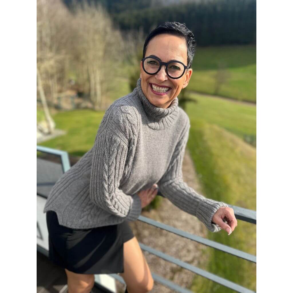 Mit dieser Strickanleitung von Kerstin Ritter strickst du dir einen kuscheligen, dicken Rollkragenpullover mit Zopfmuster. Den Pullover strickst du nahtlos von oben nach unten. Zöpfe und 2x2-Rippenmuster verlaufen dekorativ entlang der Seiten und Ärmel, wodurch ein harmonisches Gesamtbild entsteht. Der Pullover beginnt mit der Halsblende im Nacken, bevor Maschen entlang der Schulterlinie aufgenommen und die Vorderteile mit eingearbeitetem Muster geformt werden.