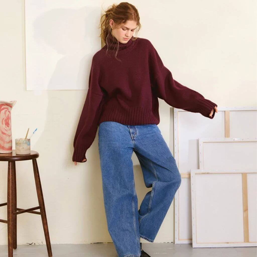 Vorder- und Rückenteil werden dann verbunden und in Runden bis zum Bündchen gestrickt. Die Ärmel werden aus aufgenommenen Maschen in Runden glatt rechts mit Abnahmen nach unten gestrickt und mit einem Bündchen abgeschlossen. Die Halskante wird zum Schluss gearbeitet.