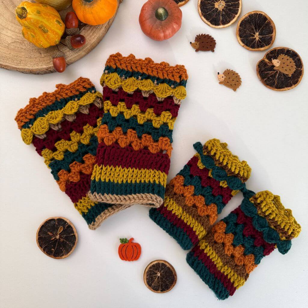 Die Stulpen lassen sich durch Maschen hinzufügen oder weglassen an deine Beine anpassen. Das Farbschema ist flexibel: Arbeite mit mehreren Farben für einen bunten Look oder nutze eine einzelne Farbe für einen schlichten Stil.