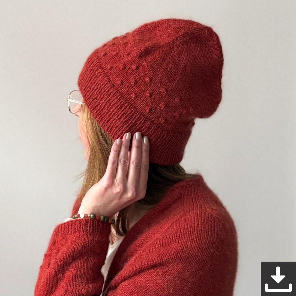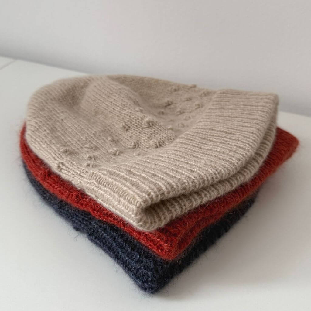 Die Dotta Mütze ist eine Strickanleitung für eine Mütze mit Popcorn-Muster über dem Bündchen. Die Mütze wird von unten nach oben in Runden gestrickt und beginnt mit einem provisorischen Maschenanschlag für ein breites doppeltes Bündchen. Das Popcorn-Muster setzt einen Akzent, während der Oberkopf glatt rechts gestrickt wird.
