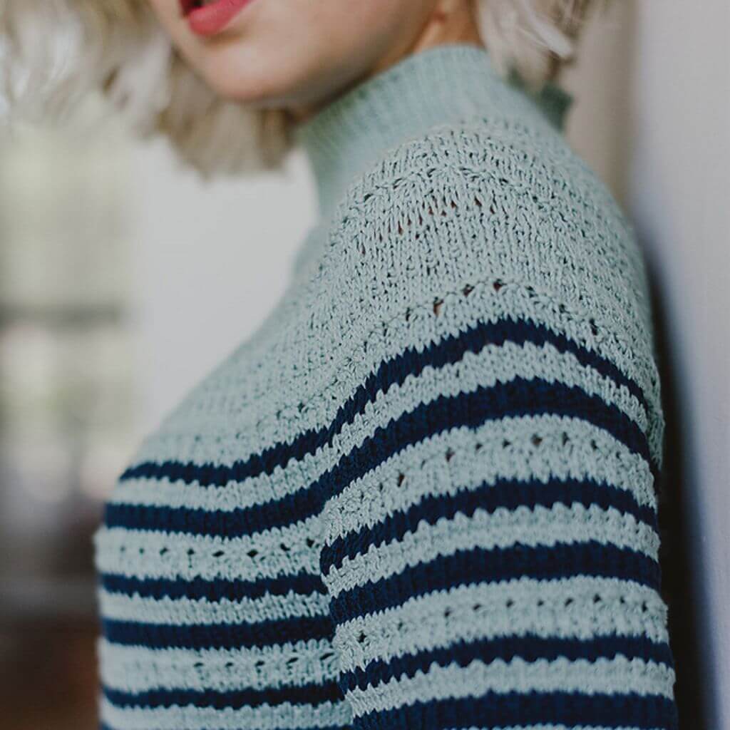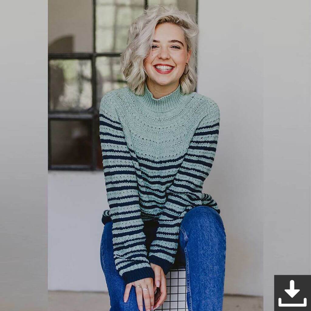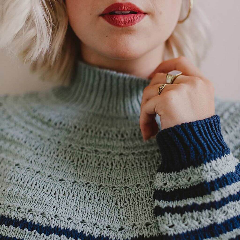 Du strickst den Pullover von oben nach unten, beginnend mit einem hohen Kragen in der Grundfarbe. Es folgt eine Rundpasse, die zunächst uni im Streifenmuster gearbeitet wird und dann in das zweifarbige Streifenmuster übergeht. Dabei nimmst du gleichmäßig über die Runden verteilt zu.