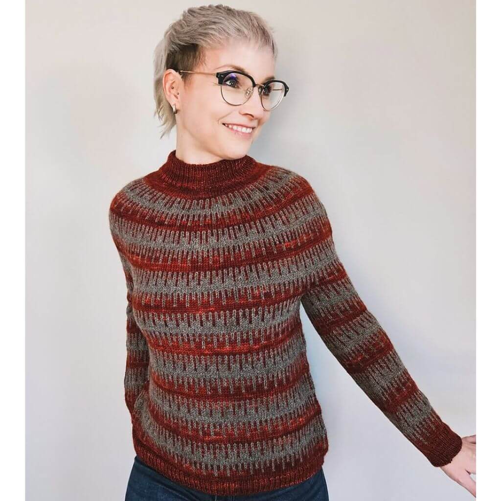 Das markante Streifenmuster des Drip Dye DK von Feinmotorik entsteht durch ein zweifarbiges Jacquardmuster, das sich von der Rundpasse über den gesamten Körper und die Ärmel zieht – ein Effekt, der durch den Wechsel von Haupt- und Kontrastfarbe im Rapport eine Art Farbverlauf erzeugt.
