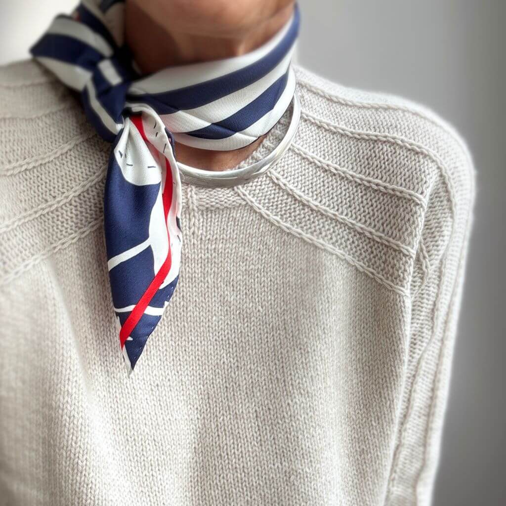 Der Pullover wird nahtlos von oben nach unten gestrickt, beginnend mit dem Kragen in Runden. Das besondere Muster-Detail am Rücken entsteht durch verkürzte Reihen, die dem Ausschnitt seine charakteristische Form geben. Anschließend wird der Körper ähnlich wie bei einem Raglan-Pullover fortgesetzt – entspannt und ohne komplizierte Konstruktion.