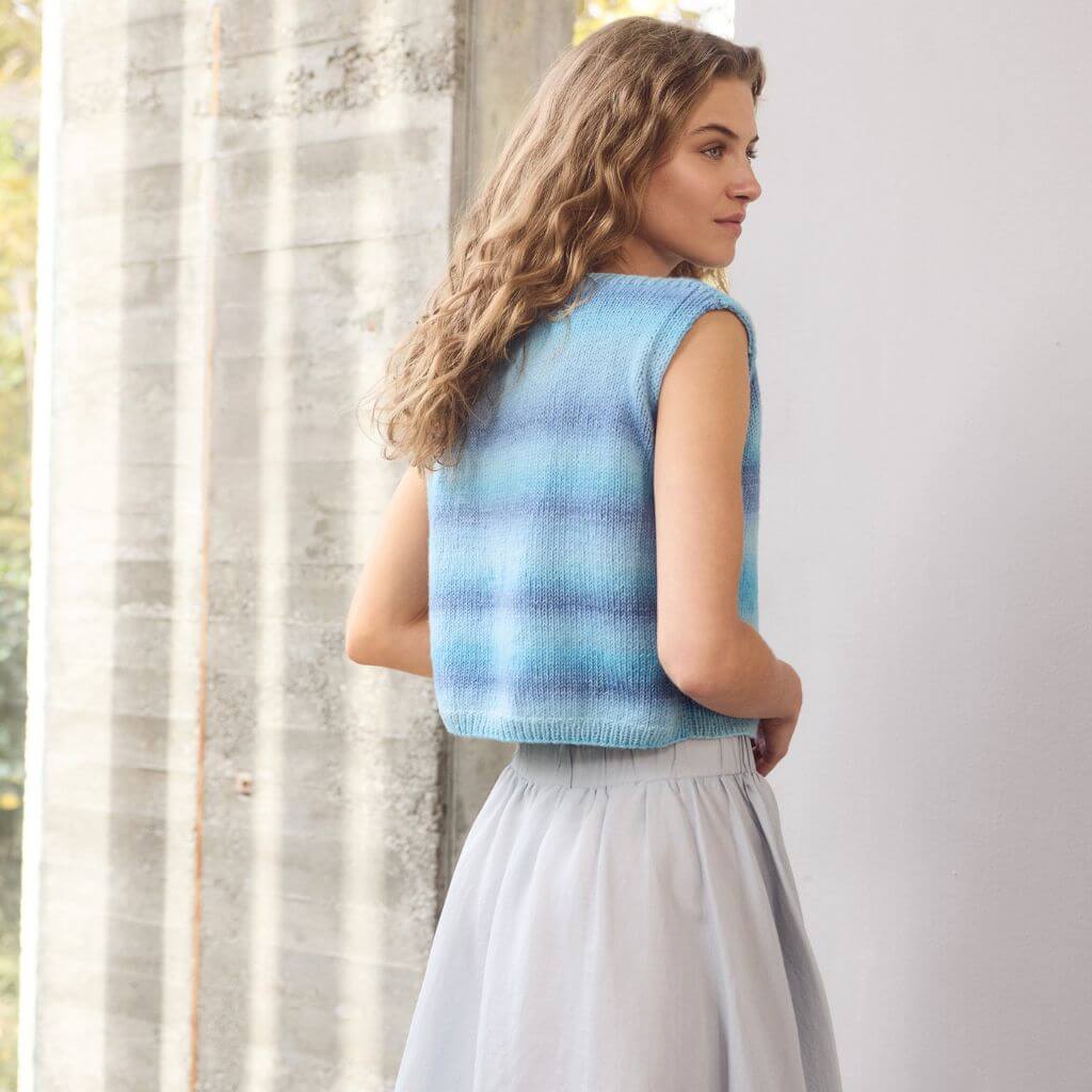Ein klassischer Schnitt mit raffinierten Details: Der Pullunder aus dem Farbverlaufsgarn Corallo überzeugt mit Bootsausschnitt und betonten Abnahmen an den Ärmeln. Der natürliche Farbverlauf des Garns erzeugt zudem ein lebendiges Bild im schlichten Glattstrick.