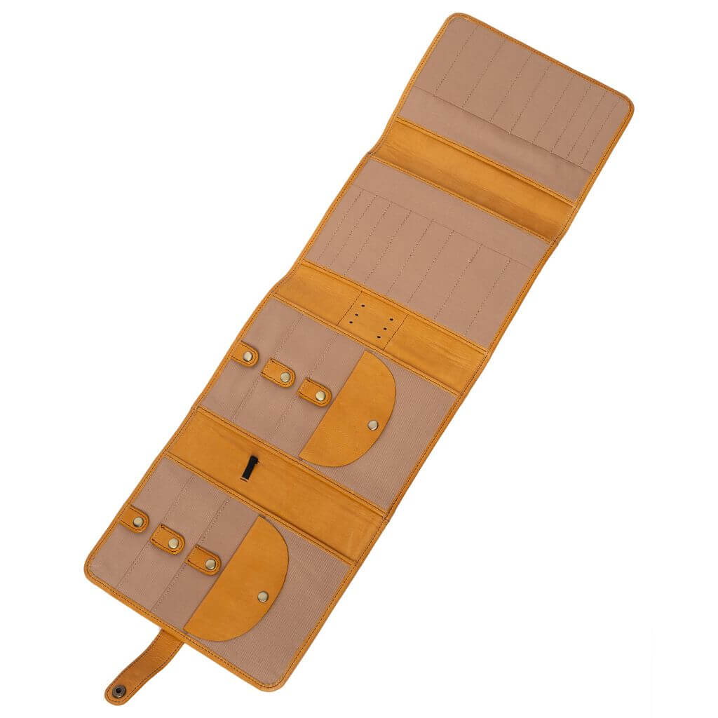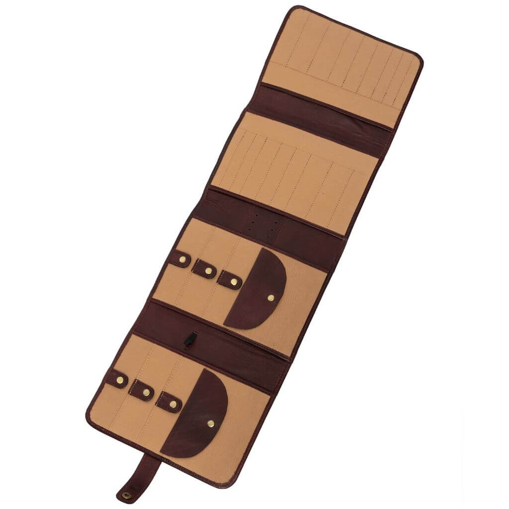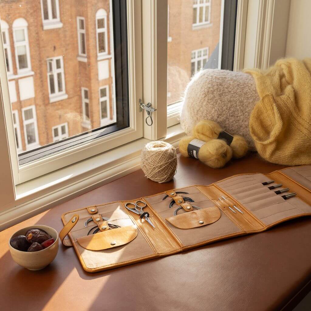 Um dein Strickzubehör leicht zu transportieren, lässt sich das XL-Nadeletui aus weichem Leder elegant zusammenfalten und mit einem Druckknopf verschließen.