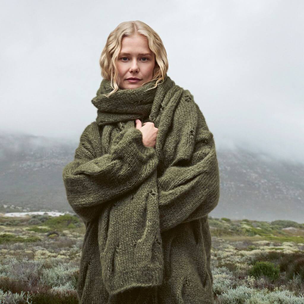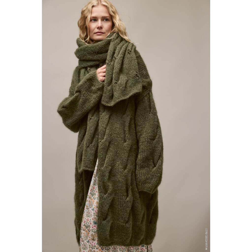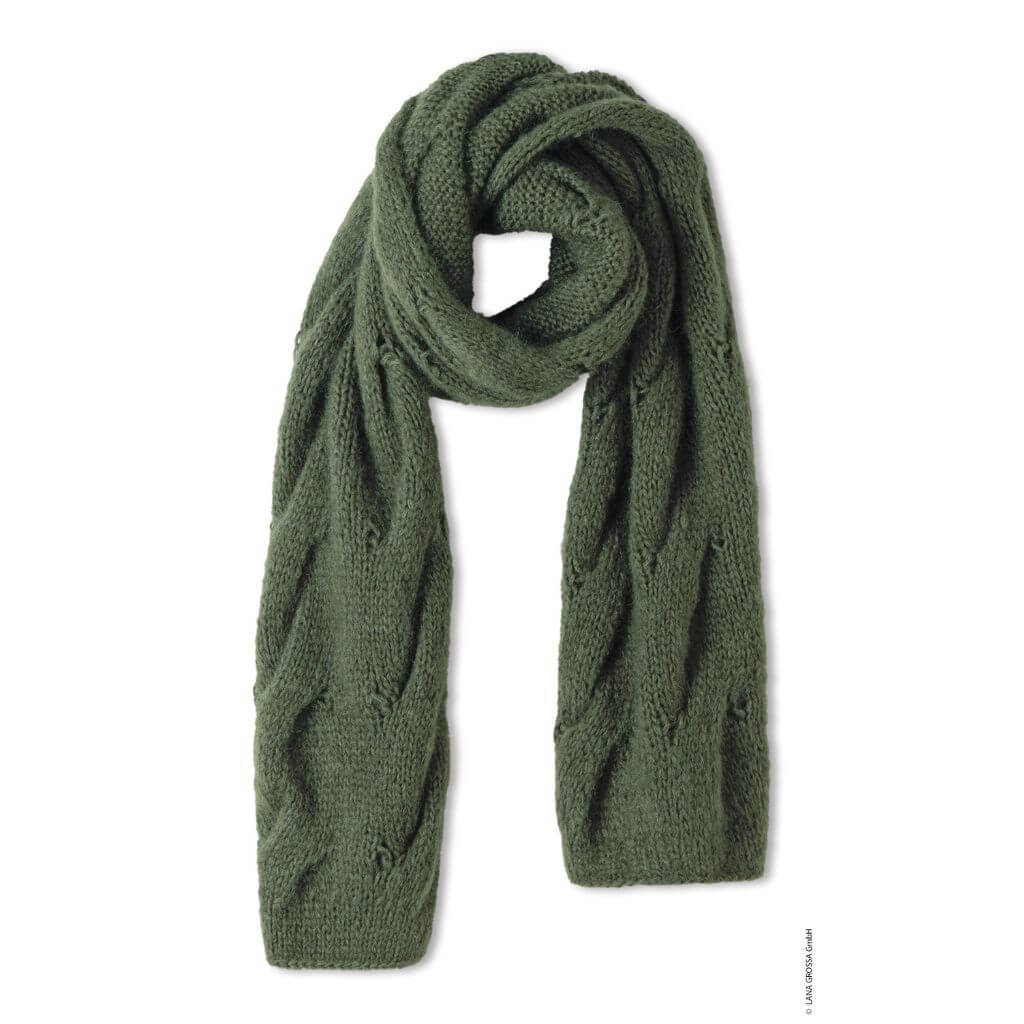Diese Strickanleitung zeigt dir, wie du einen Schal mit plastischem Zopfmuster strickst. Das Modell aus dem Heft Nordic Knits 4 verwendet Mohair di Gio in Farngrün und wird zu einem Accessoire mit einer Größe von 40 cm x 210 cm.