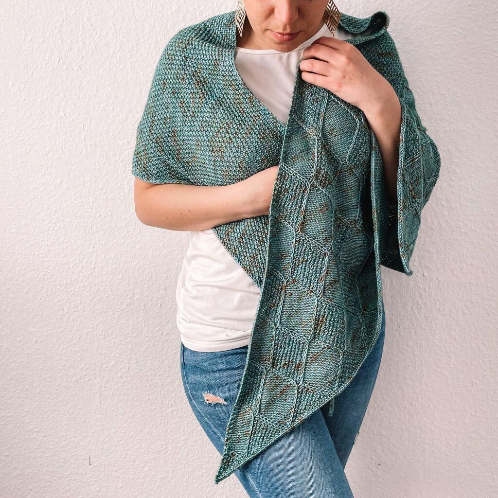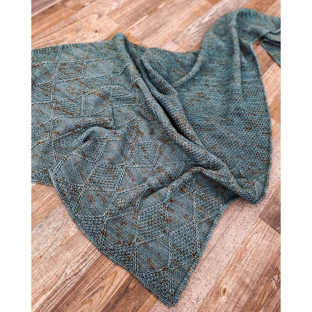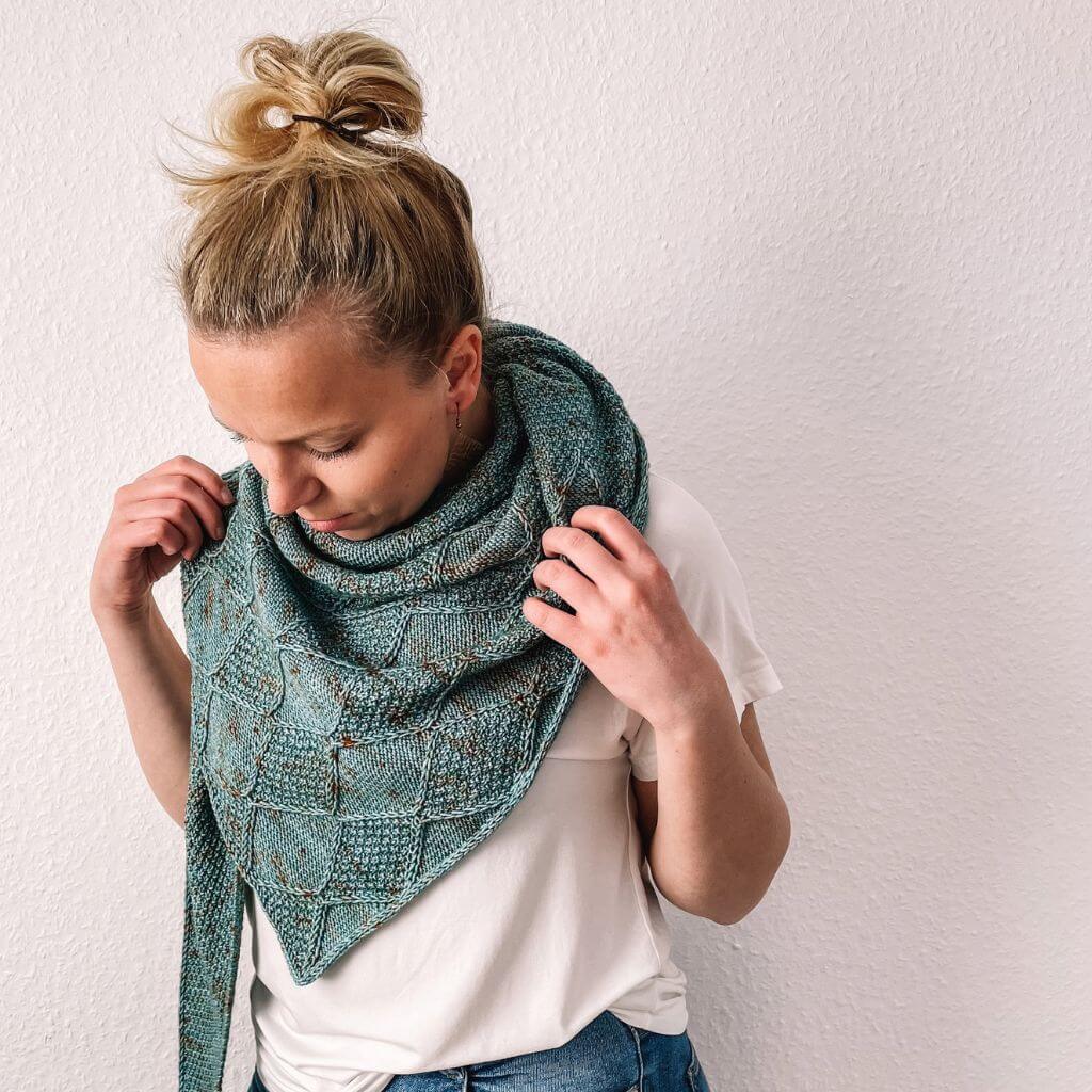 Die Rusty Romance Strickanleitung von Rina Lehmann zeigt dir, wie du ein asymmetrisches Dreieckstuch mit Rautenmuster strickst. Du arbeitest das Tuch seitlich mit kontinuierlichen Zunahmen und gestaltest die Borte durch verkreuzte Maschen. Das Muster kombiniert ein großes Perlmuster mit einem strukturierten Rautenrapport. Der I-Cord Abschluss gibt der Kante ein sauberes Finish.
