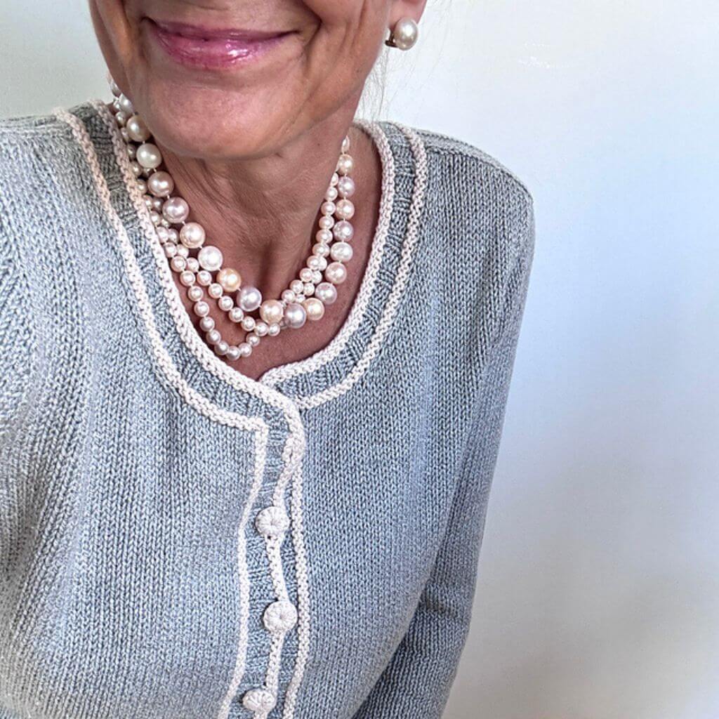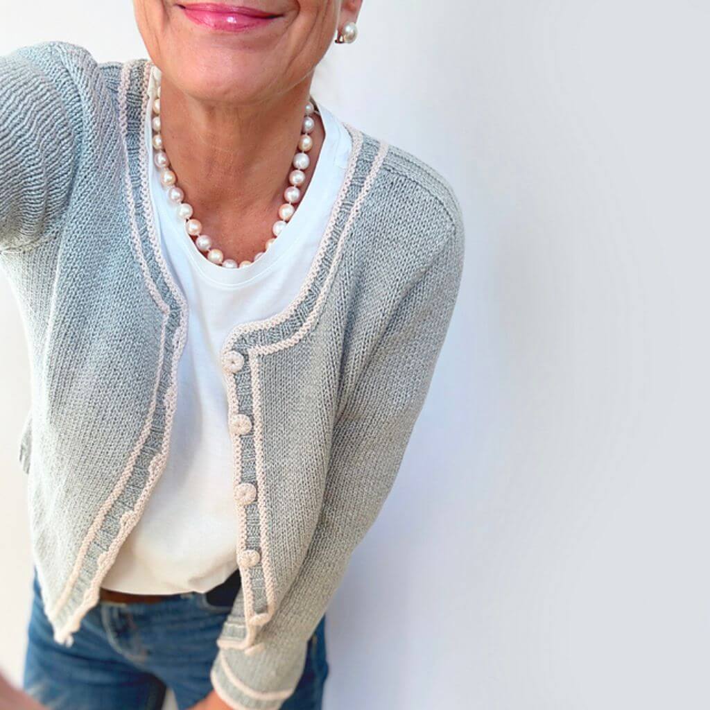 Zeitlos und immer in Mode wie eine Jacke im Chanel-Stil – Bright as a Button passt immer und zu jedem Outfit. Diese klassische Strickjacke besticht durch Farbakzente, raffinierte Details und die entzückendsten Häkel-Knöpfe. Das komplette Strickstück wird nahtlos in einem Stück von oben nach unten gearbeitet, beginnend mit den Schulterpassen, gefolgt vom oberen Rücken mit verkürzten Reihen für die Schulterschräge.