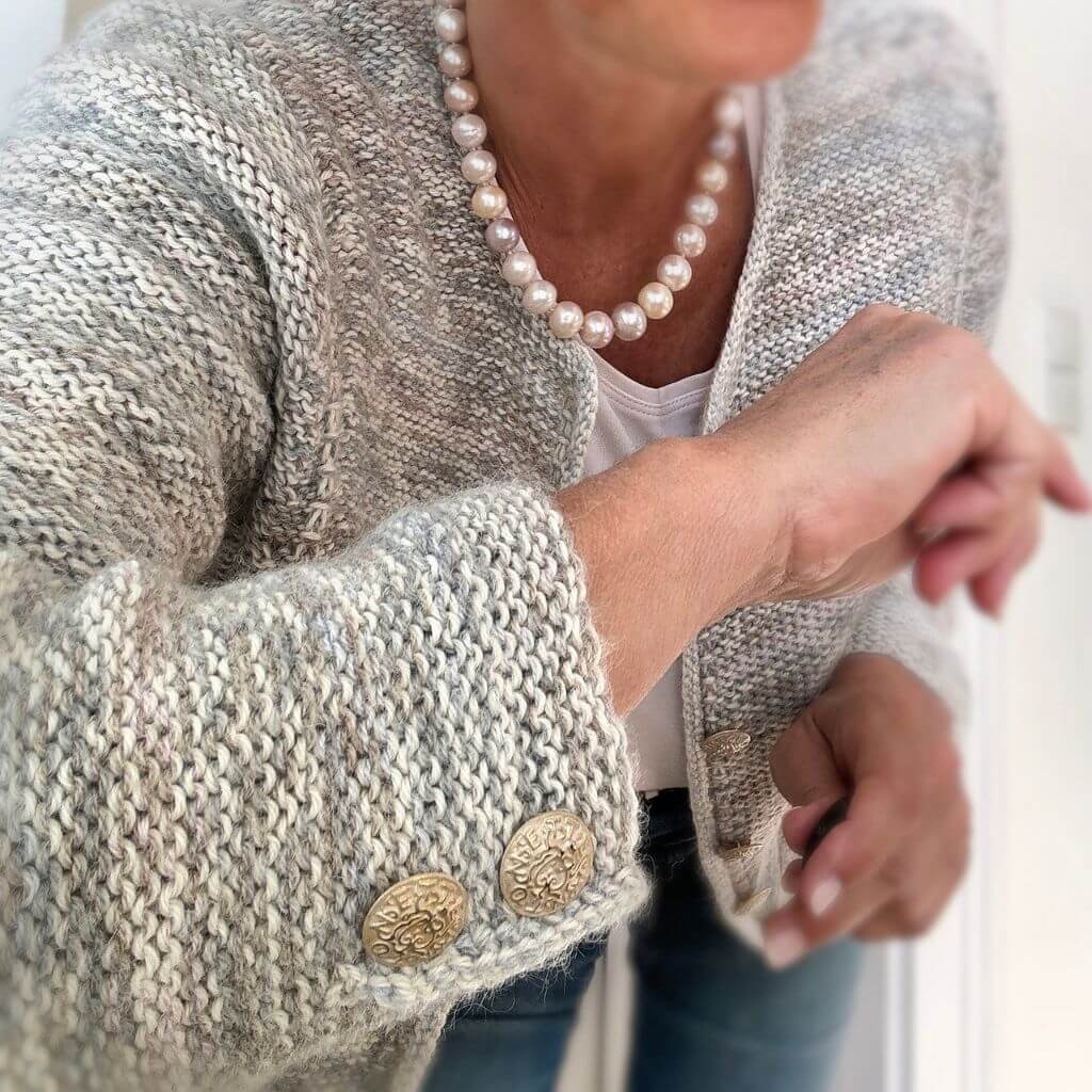 Besonders praktisch: Du kannst die Jacke während des Strickens anprobieren und individuell anpassen. Die Anleitung bietet drei Varianten für Taillen- und Hüftweite, damit deine Jacke perfekt sitzt. Die Ärmel werden in Runden mit einem dekorativen Schlitz gestrickt.