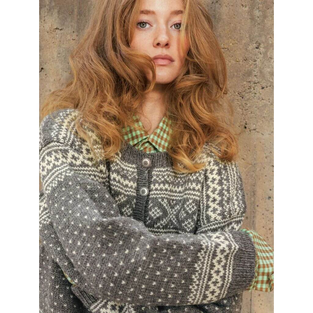 Die Setesdal Damekofte Strickanleitung von Sandnes Garn zeigt dir, wie du eine traditionelle norwegische Strickjacke mit Musterpasse strickst. Das Design kombiniert das charakteristische Setesdal-Muster mit einer klassischen Schnittform und Metallhaken als Verschluss.
