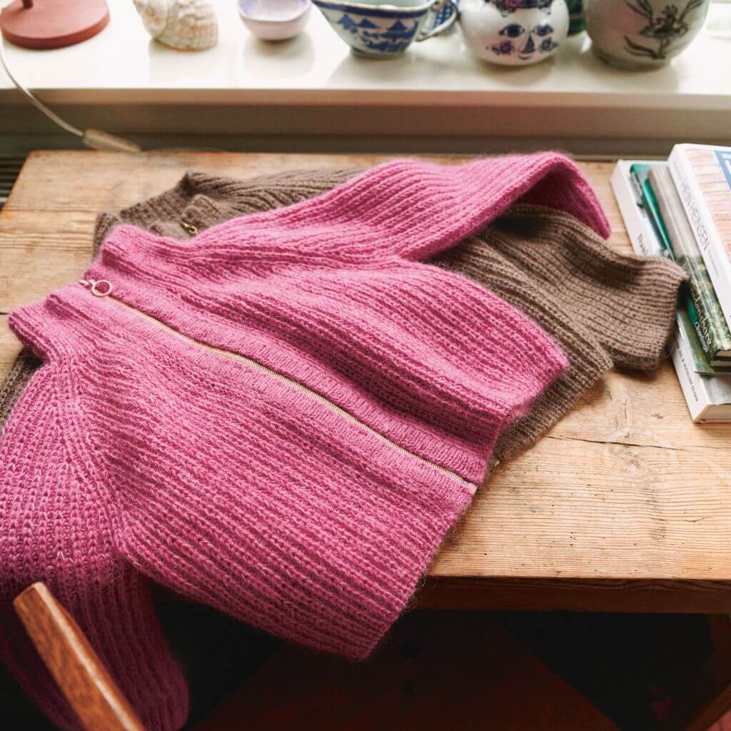 Die Tia Zipper Jacket Junior ist eine Strickjacke mit Reißverschluss und markanter Halbpatent-Struktur. Du strickst sie von oben nach unten mit Raglanzunahmen, was eine bequeme Passform ergibt.