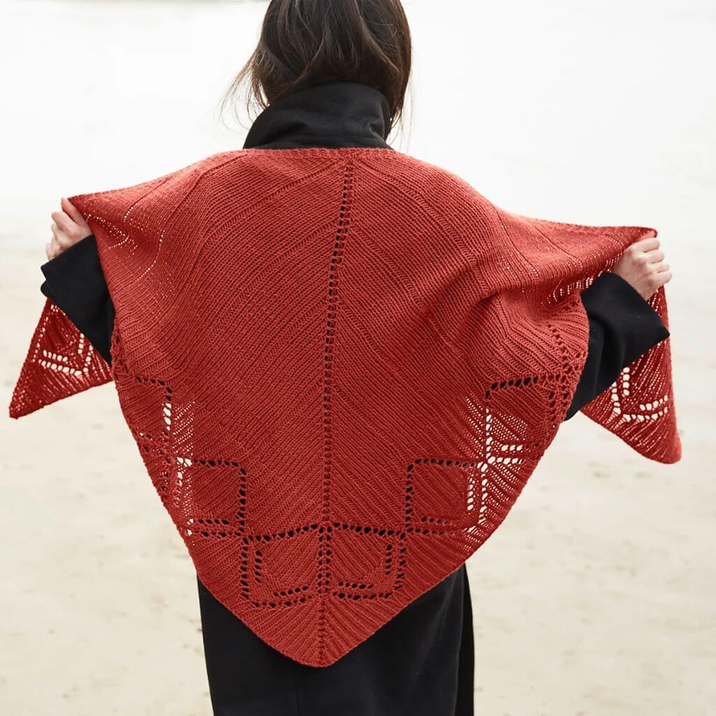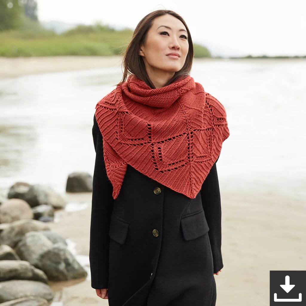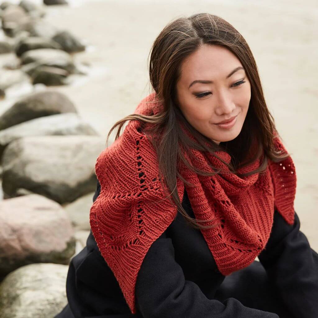 Die Strickanleitung Ating führt dich Schritt für Schritt zu einem Dreieckstuch mit Lace-Rauten. Das Design von Inese Sang kombiniert Rippenmuster mit dezenter Mittellinie und großen Lace-Rauten an der Abschlusskante. Du strickst von der oberen Mitte ausgehend in die Breite - die Dreiecksform entsteht durch gleichmäßige Zunahmen.