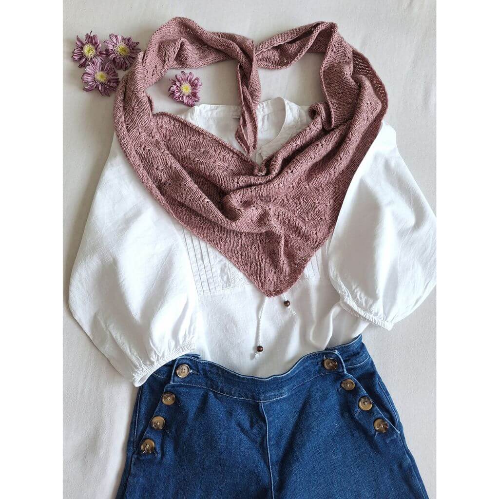 Mit der Luisa Shawl Anleitung von Madame Nadelspiel strickst du dir ein Dreieckstuch in zwei Größen. Das Tuch wird flach in Reihen von der Spitze aus nach unten gestrickt und wächst dabei durch regelmäßige Zunahmen. Die Anleitung führt dich durch jede einzelne Reihe mit präzisen Angaben zum Blumenmuster.