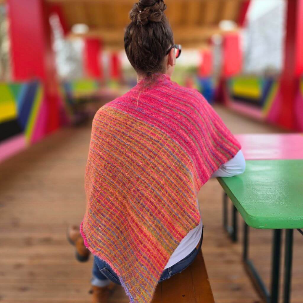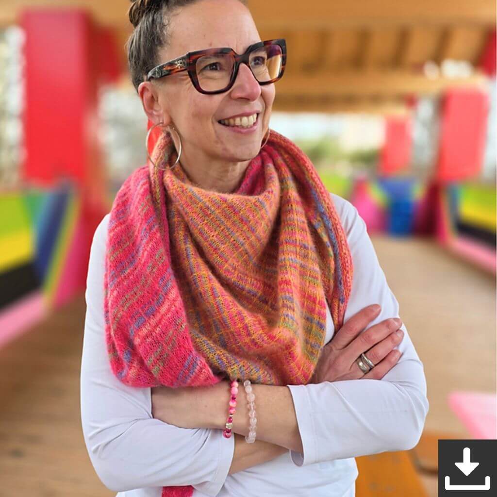 Das Tuch wird mit drei Farben gearbeitet: Lana Grossa Cosy Socks Multi Stripes als Grundfarbe sowie zwei Töne Silkhair als Kontrastfarben, die nacheinander zum Einsatz kommen. Die Größe lässt sich durch mehr oder weniger Muster-Rapporte ganz nach Wunsch anpassen – auch an die vorhandene Garnmenge. Abgeschlossen wird das Tuch mit einem I-Cord-Rand.