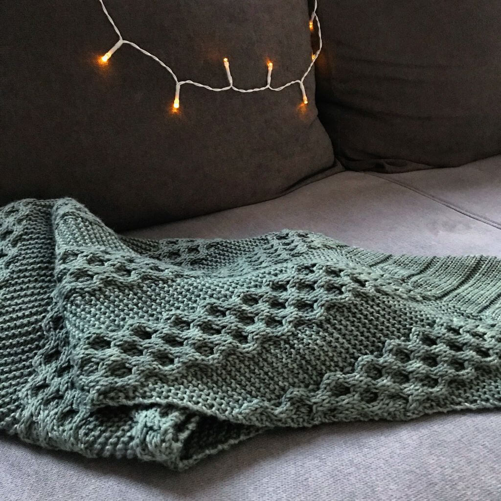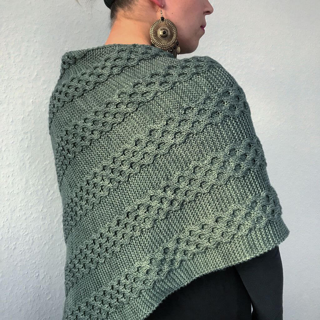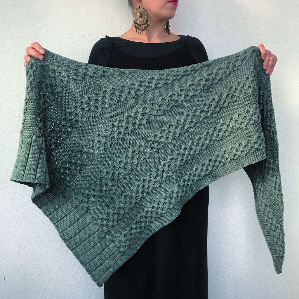 Das Modell Sweet Pistachio von Rina Lehmann kombiniert Zopfmuster-Abschnitte mit Kraus-rechts-Bereichen zu einem asymmetrischen Tuch. Die Zopfmuster setzen sich durch den Kontrast zu den glatten Bereichen in Szene und werden mit einer Rippenborte abgeschlossen. Das Design eignet sich für Garne mit zartem Glanz, da sie die Struktur der Zöpfe betonen.