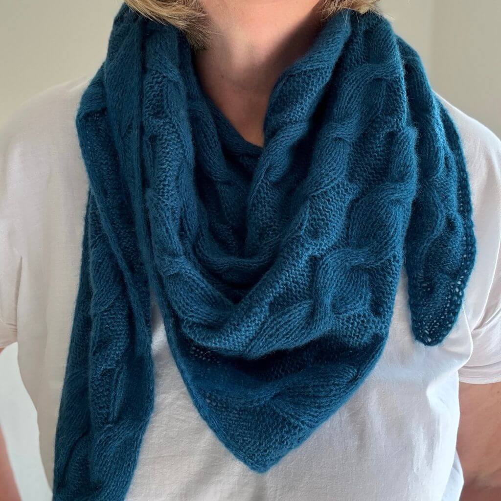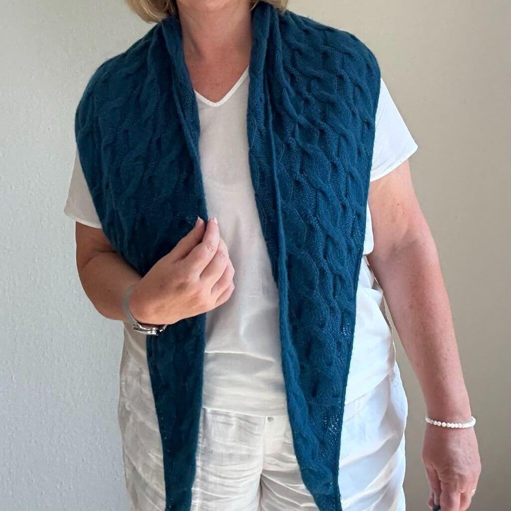 Das Tuch wird von einer Seite zur anderen gestrickt und mit einer I-Cord-Kante eingefasst. In der ersten Hälfte werden die Zöpfe nach rechts gestrickt, in der zweiten nach links - dadurch zeigen sie beim Tragen auf beiden Seiten nach außen. Das Rippenmuster basiert auf 8-Maschen-Blöcken mit Zöpfen in den glatt rechten Bereichen.